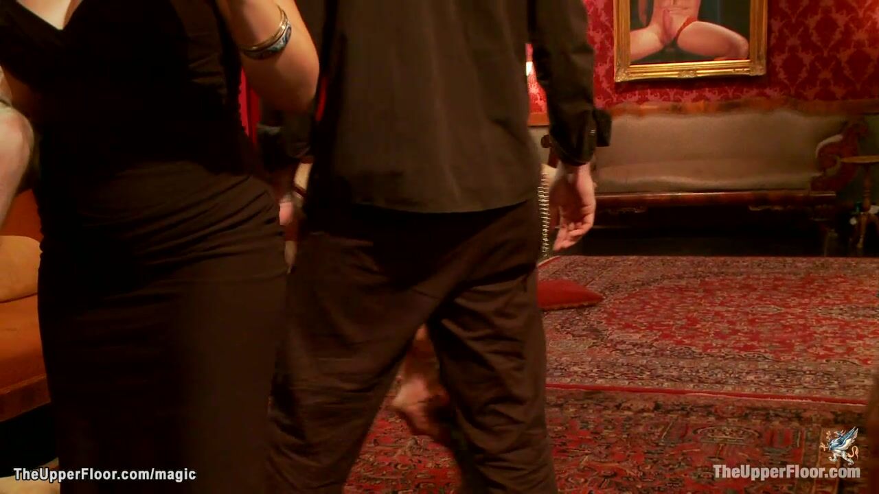 Newbie house slave Coral Aorta is walked on all four on a leash then with Proxy Page and other slaves shamed and fucked at bdsm party in the Upper Floor
