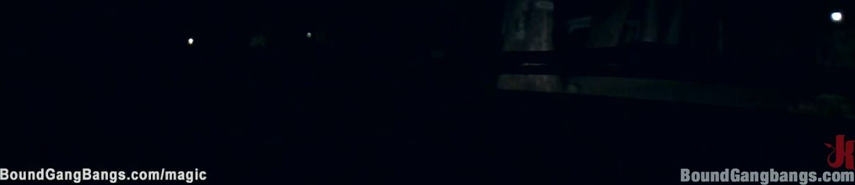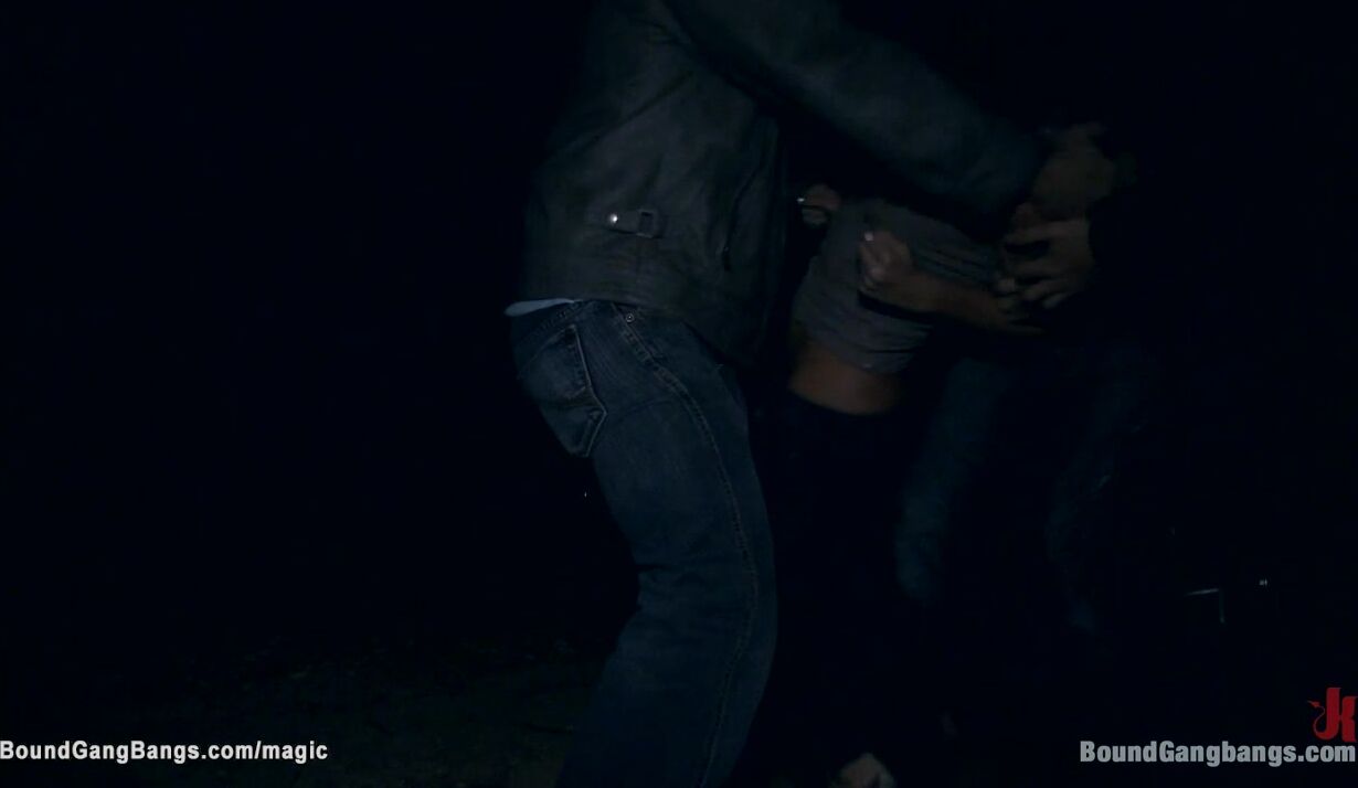 Sexy brunette teen Kenzie Vaughn drove by bf James Deen and his friends in woods at night and in human bondage rough double penetration fucked by big dicks