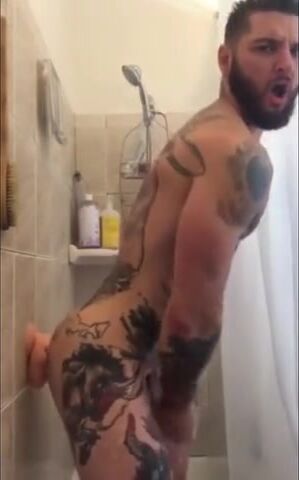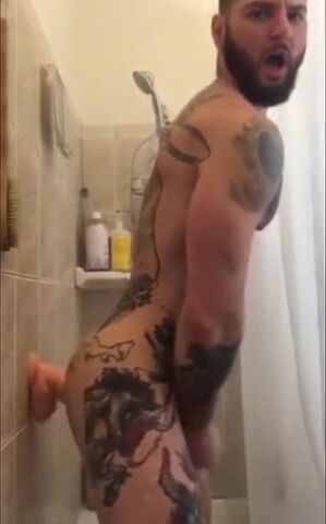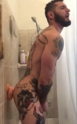 Tatted Hunk Fucks Dildo in Shower Until He Cums