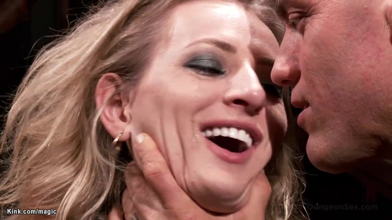 Blond slave Natasha Starr is bound and vibed in basement then suspended gets mouth fucked then hairy pussy pounded and face cummed by big cock master Derrick Pierce