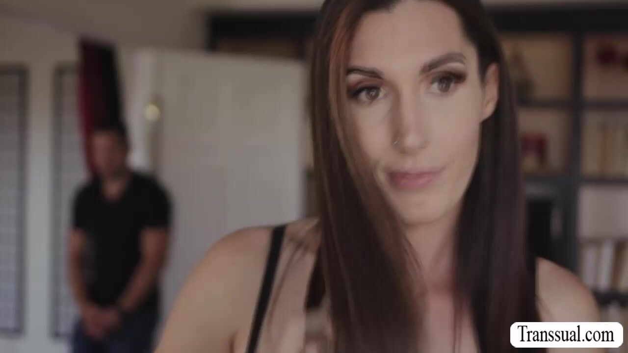Busty milf TS seduces her handsome stepson to have sex with her instead of going to the party.She starts kissing him and she then throats his hard big cock passionately.In return,her stepson bareback fucks her tight wet ass so deep and hard.