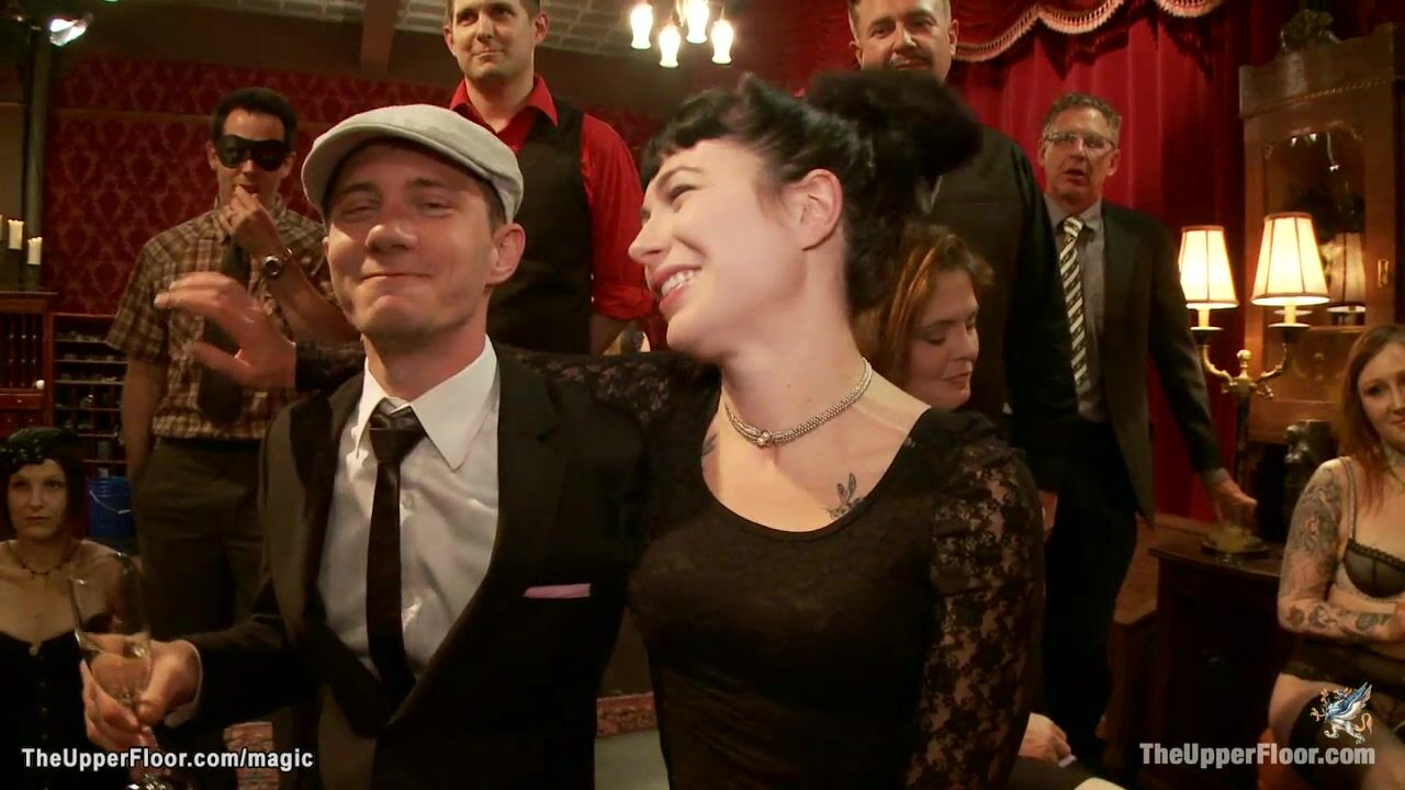 Big fake boobs brunette slave Penny Barber is bound on back and mounted on vibrator then with Claire Robbins fingered at orgy party by master James Mogul and Maestro Stefanos in the Upper Floor