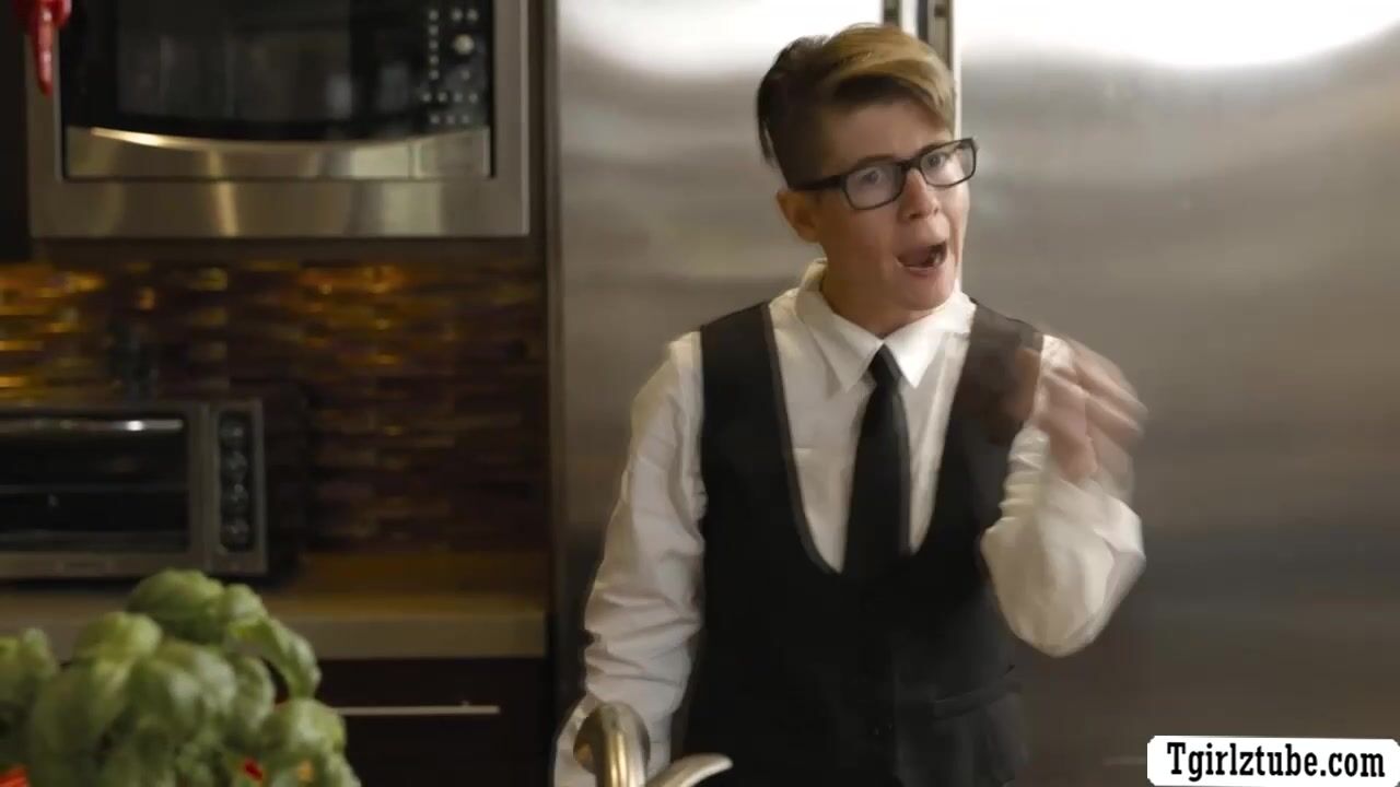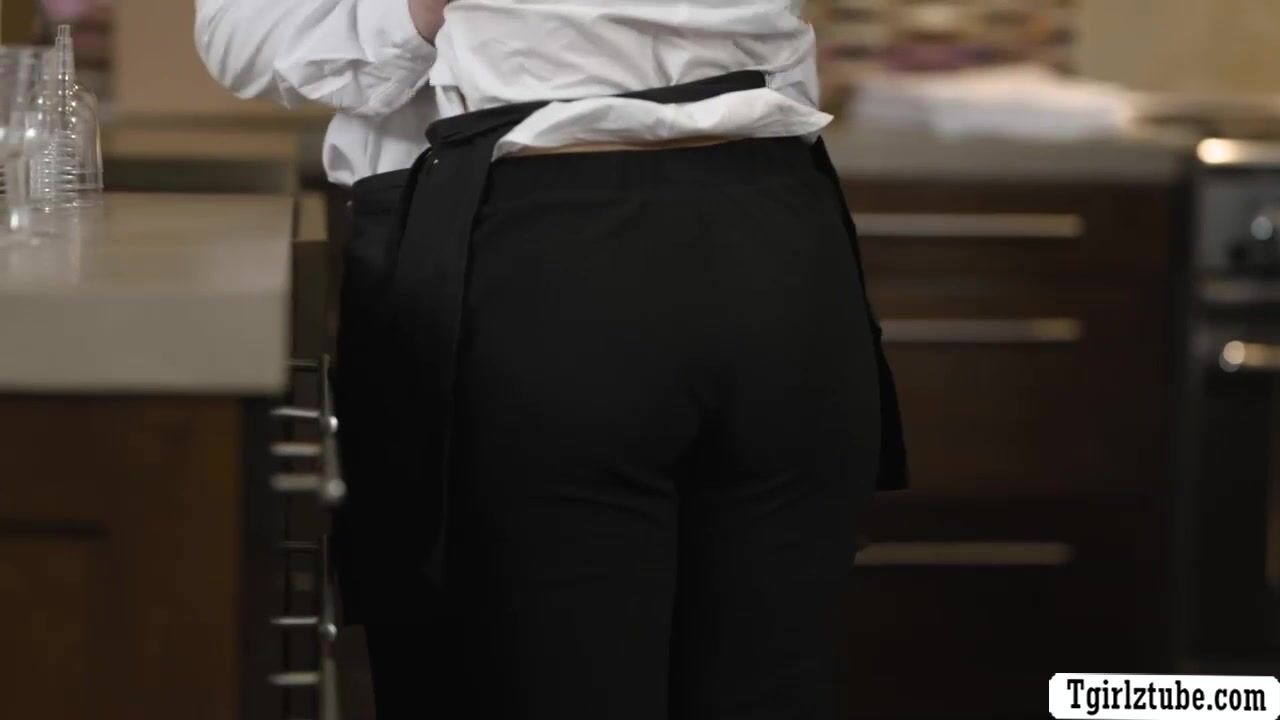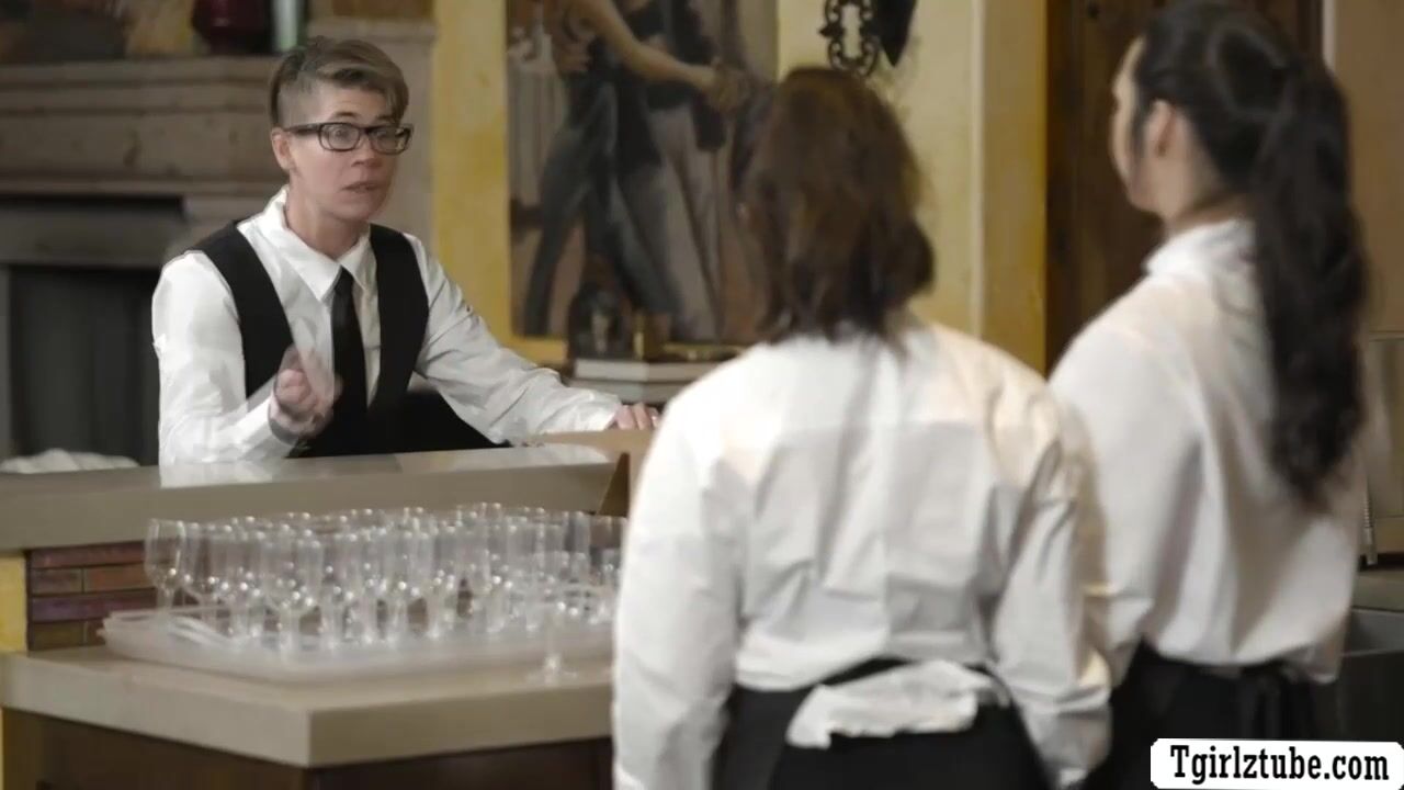 Sexy shemale and petite babe arrive in the private home for their first day of work as a waitress.Instead of doing the job,they start kissing each other and TS brunette licks the pussy of petite waitress before she fucks it so deep and hard.