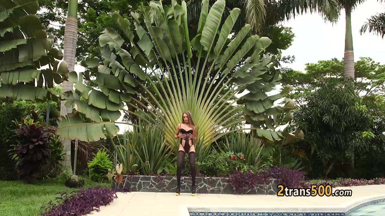 Busty shemale beauty in stockings blowed four horny cocks of some dudes then got her sexy tgirl booty gangbanged deep and hard and she enjoyed it