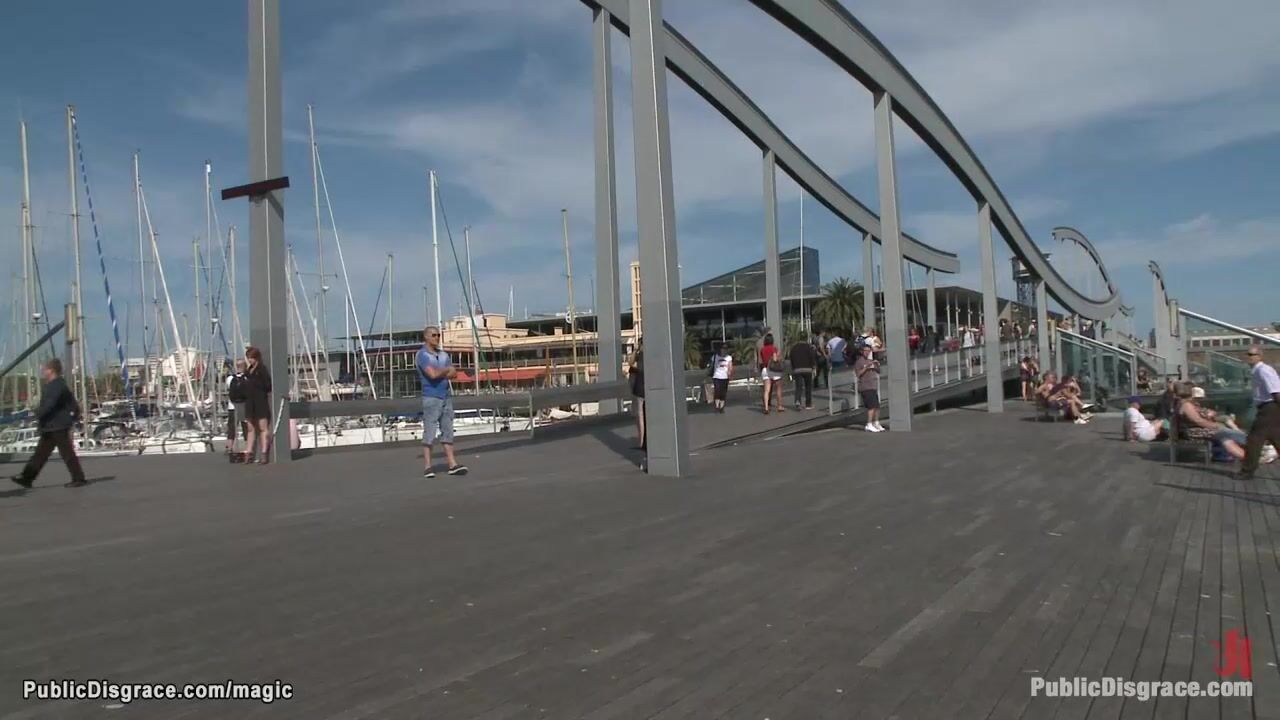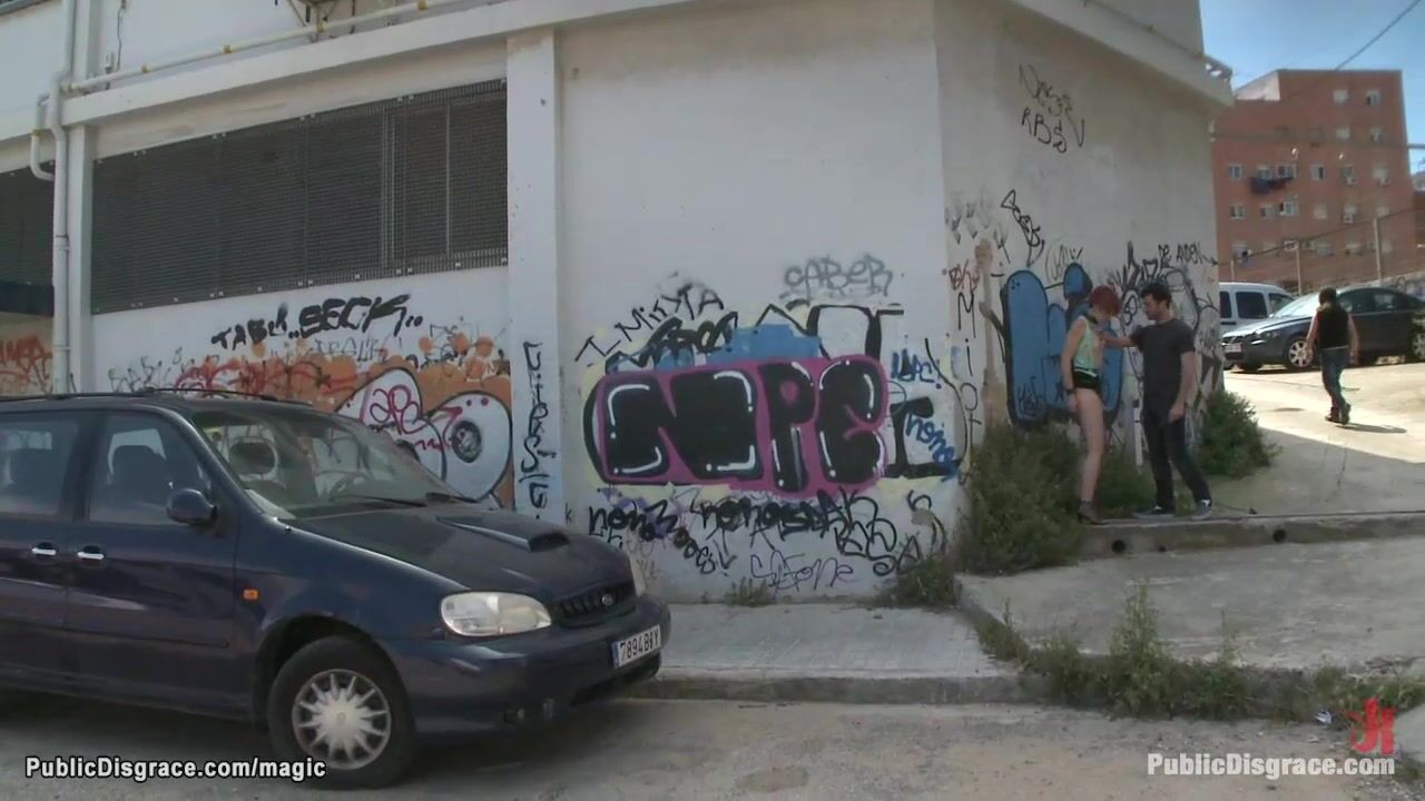 Beautiful redhead European babe Yakima Squaw gets deep throat fucked outdoor in public then spanked by strangers and walked naked for onlookers by master James Deen