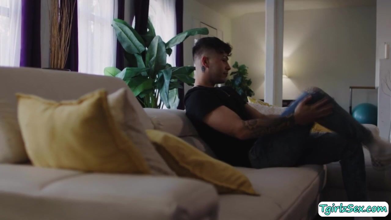 Brunette small tits shemale Ariel Demure striptease lingerie flirting with hunk stepbro in bed. The skinny tbabe whips out his big cock for a deepthroat blowjob while masturbating big tranny cock then bends over to straddle her big ass with hardcore anal bareback.