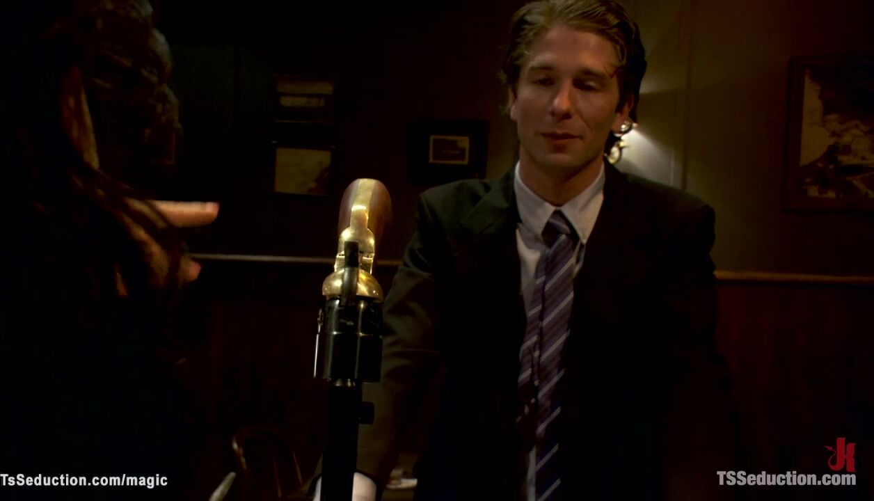 Big tits brunette tranny bartender Ts Foxxy after closing time seduces client Chris Archer and sucks his big cock then anal fucks him on the floor