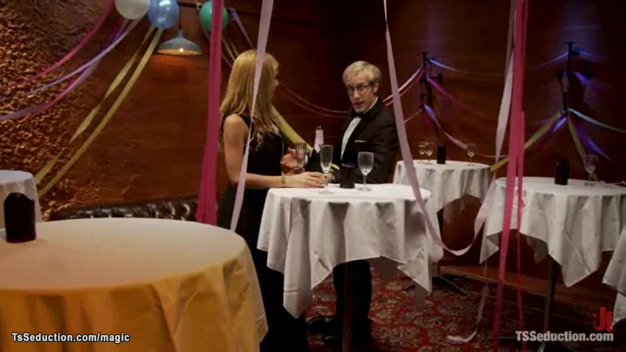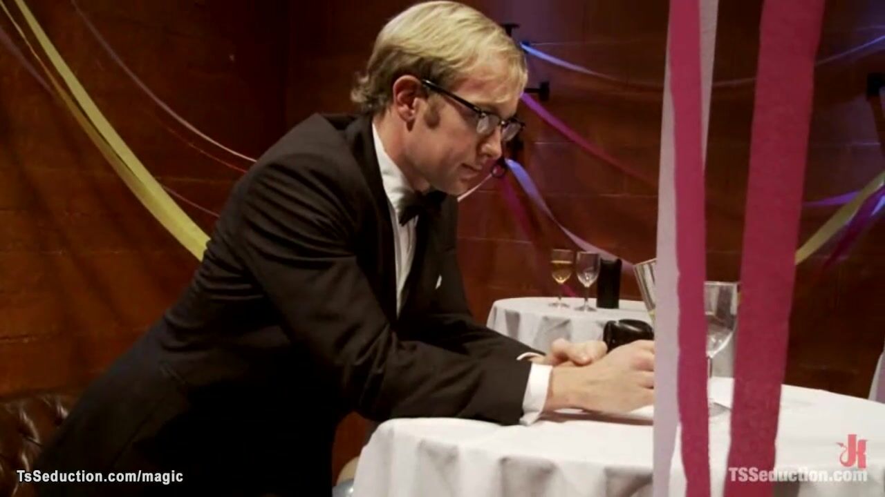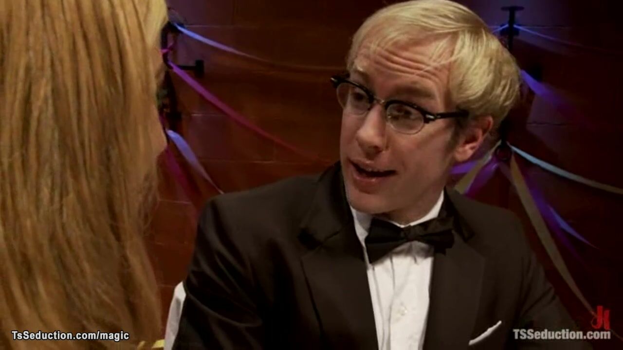 Latina Shemale bombshell Jessica Host seduces blond man Ned Mayhem at party then with hard big cock anal fucks him balls deep in various positions