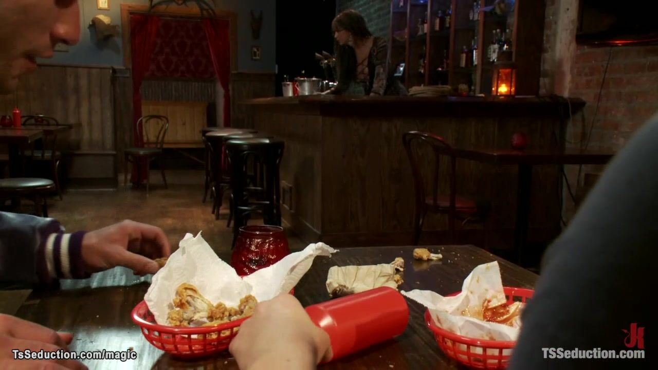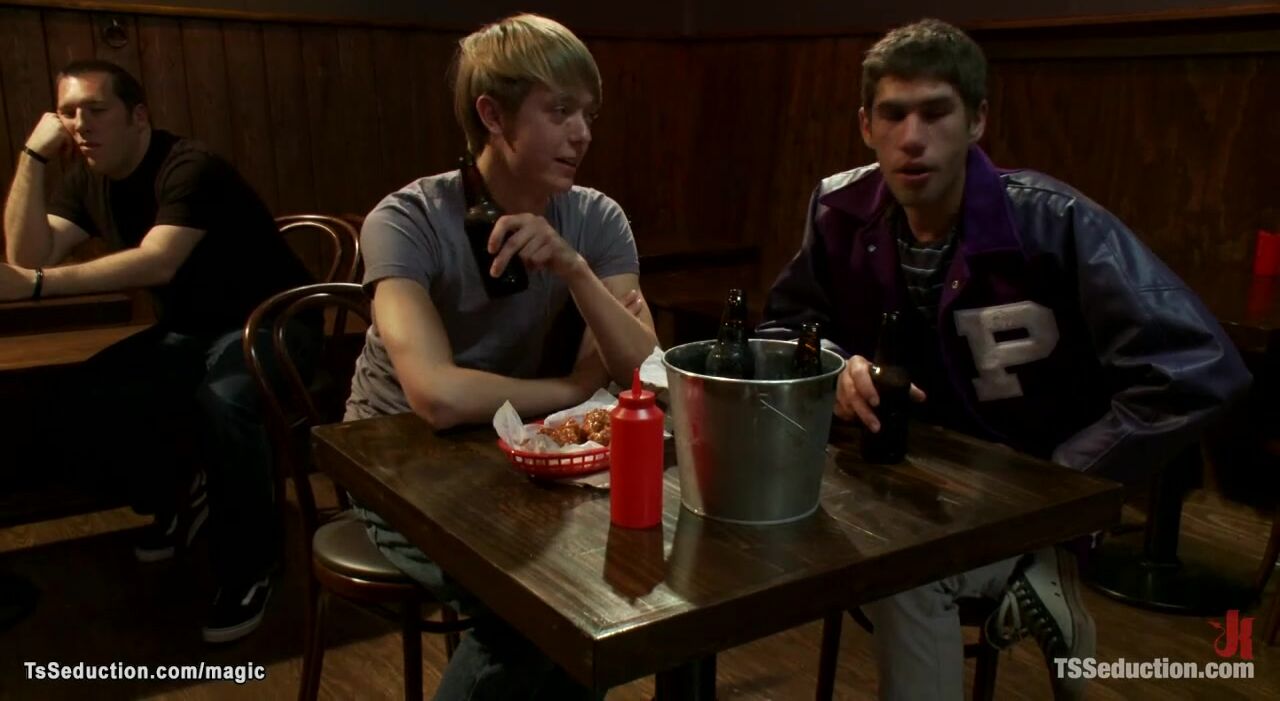 Huge tits Asian shemale bartender Yasmin Lee binds two althletes Koby Fox and Robert Bridges and anal fucks them with big cock in bar