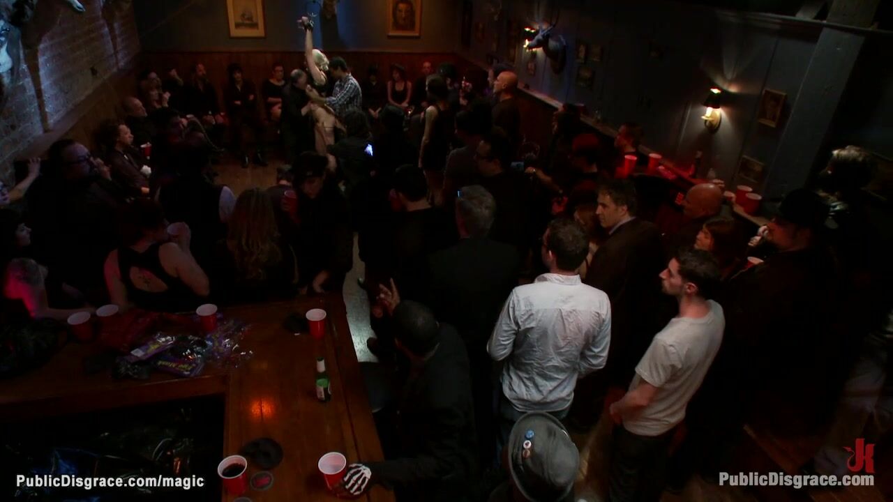 Bound blonde Natasha Lyn with hands above head gets groped by strangers in crowded public bar then gang bang fucked by big cocks in various positions