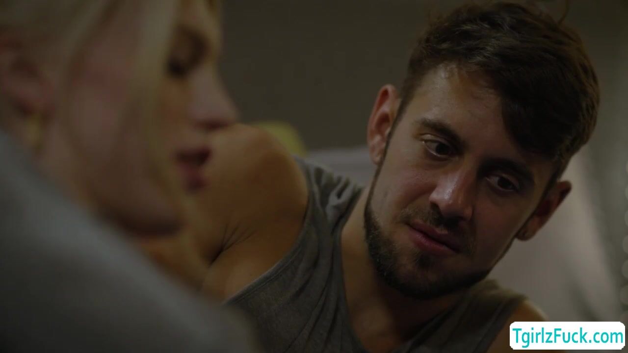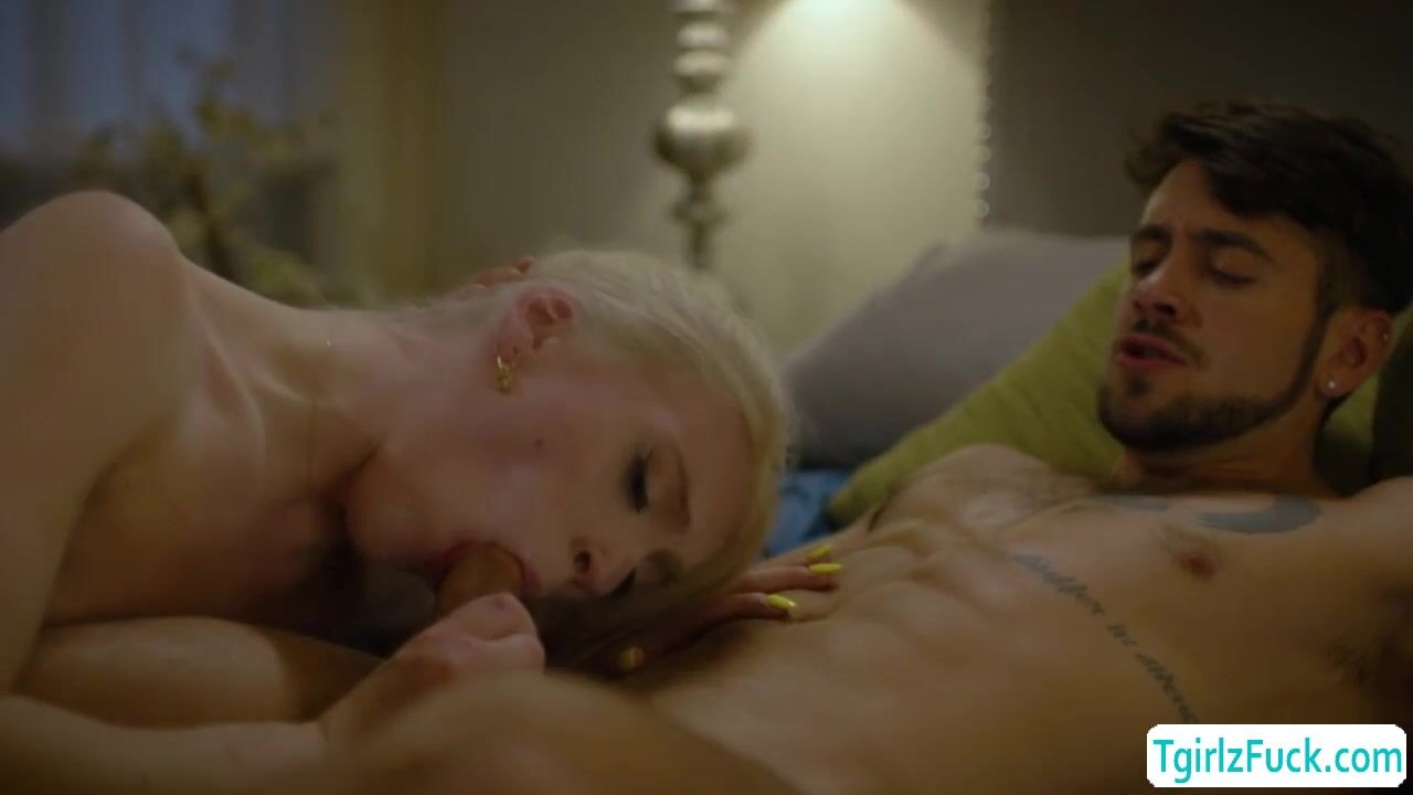 Tall brunette shemale Izzy Wilde passionately kissing hunk stud then take turn blowjob deepthroat big cocks. The small tits tbabe stretches huge asshole for a hardcore anal barebacked doggystyle and missionary while masturbating her huge tranny dick.
