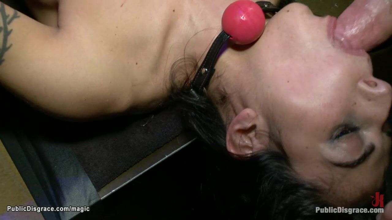 Hot brunette slave Lou Charmelle with butt plugged and blindfolded is bound to post and whipped then group fucked and made rimming Princess Donna Dolore in public crowded bar
