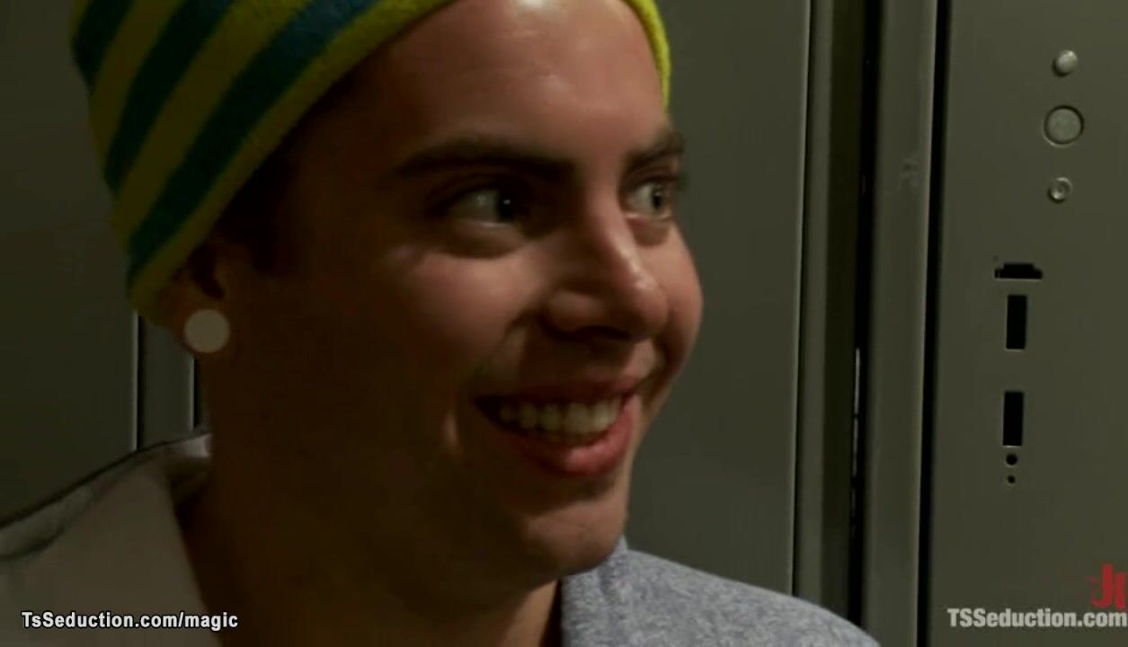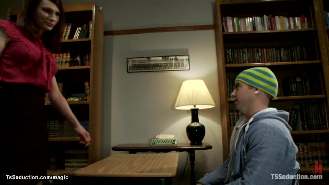 Shemale professor Dina Swift strips off to sexy glamorous lingerie and sucks and wanks cock to her student Jack Thunda then anal fucks him and makes cum in classroom