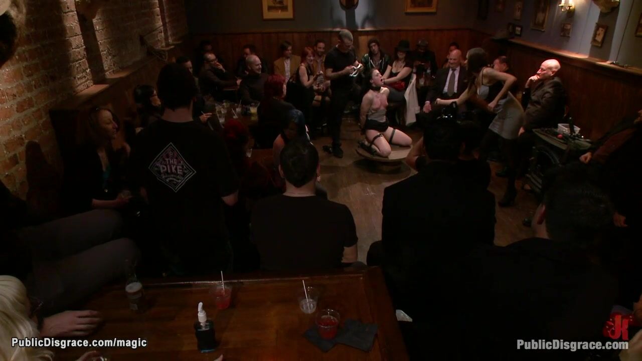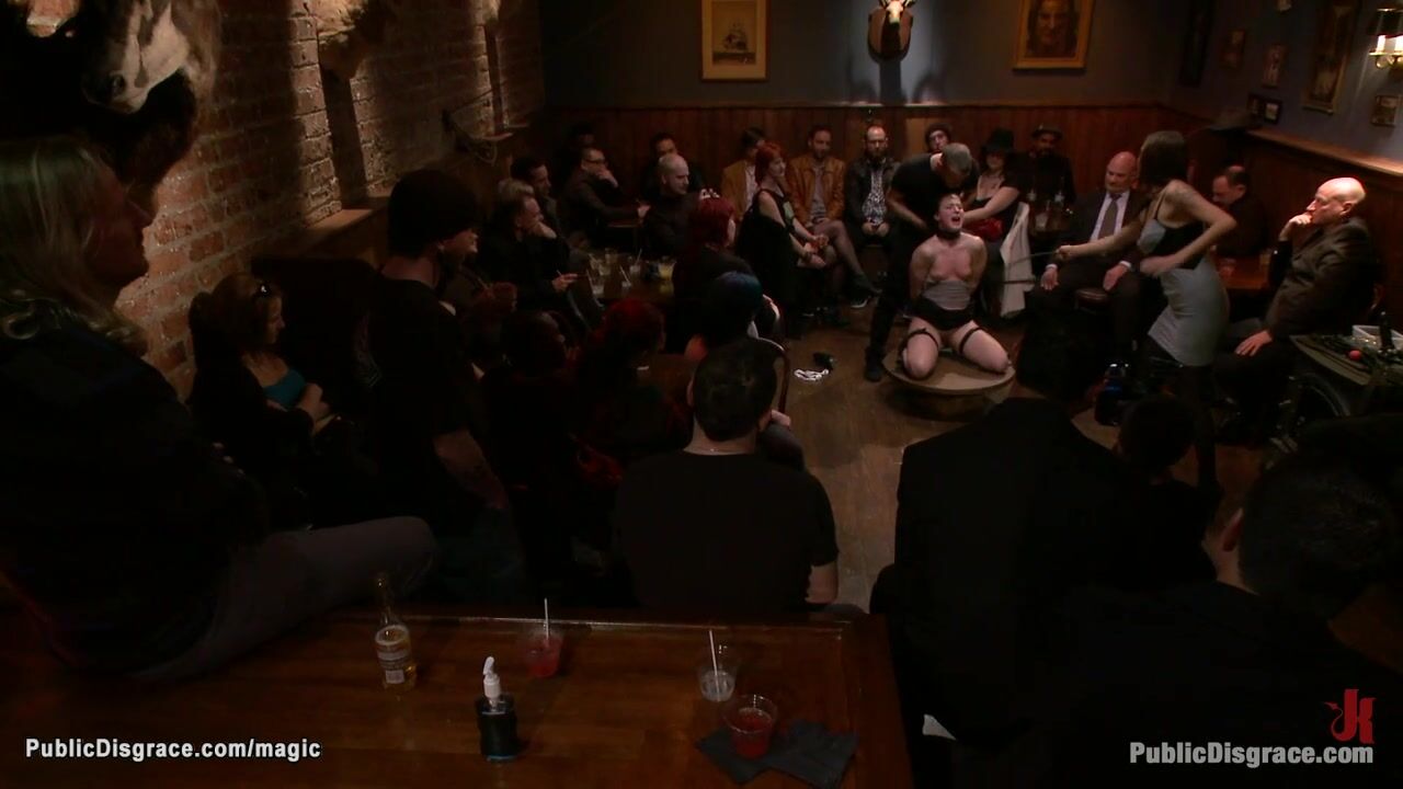 Bound brunette babe Cheyenne Jewel gets whipped then in doggy style position with head trapped in box anal fucked by big cock in crowded public bar