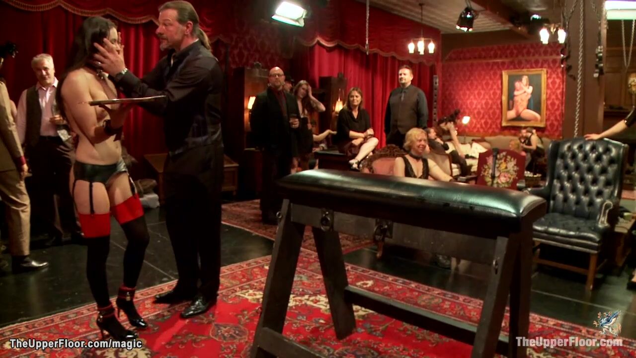 Submissive slaves Casey Calvert and Alani Pi in lingerie serving cocks to guests at orgy party then sucking big cock and swapping cum from Bill Bailey in the Upper Floor