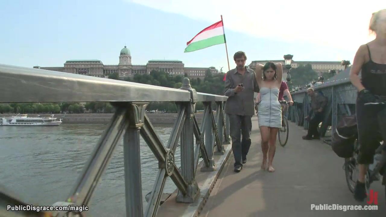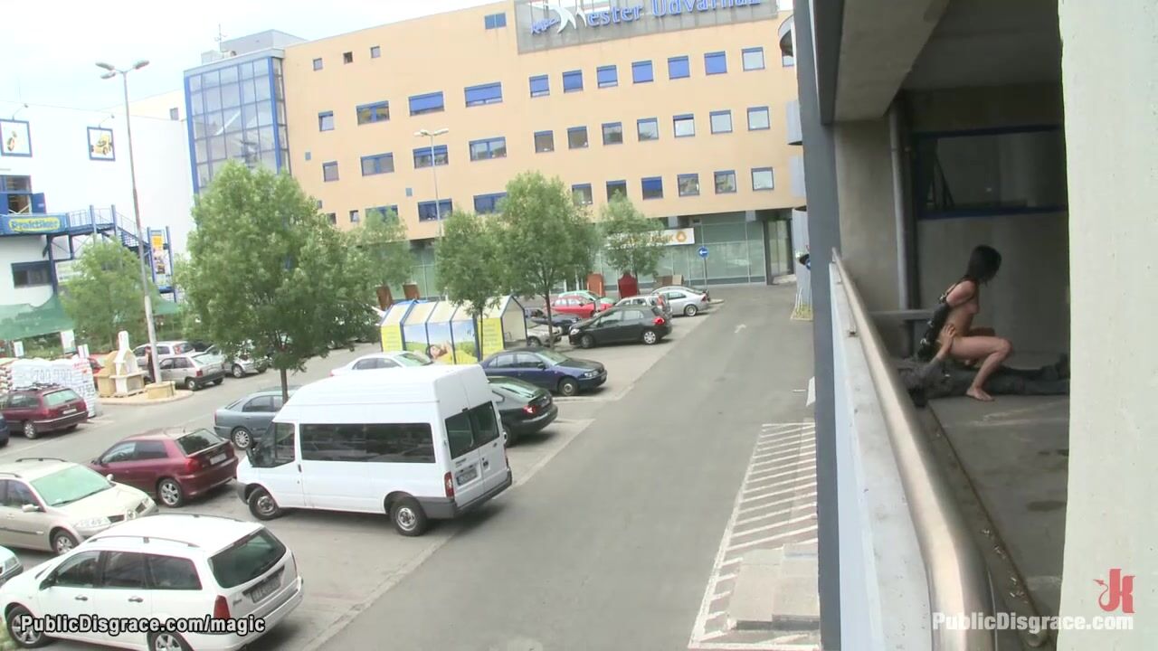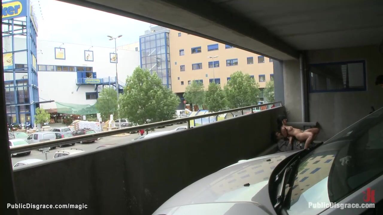 Bound in the public park slim brunette European babe Lucy Bell gets throat fucked then pussy banged in garage by big cock master Steve Holmes