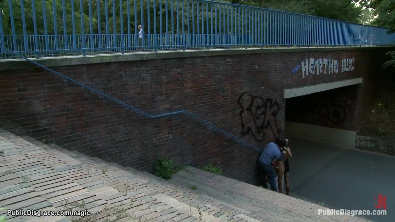 Hot German brunette slave Black Lady walk in public with remotely controlod vibrator in pussy then blindfolded with leather mask throat fucked by huge cock Tommy Pistol