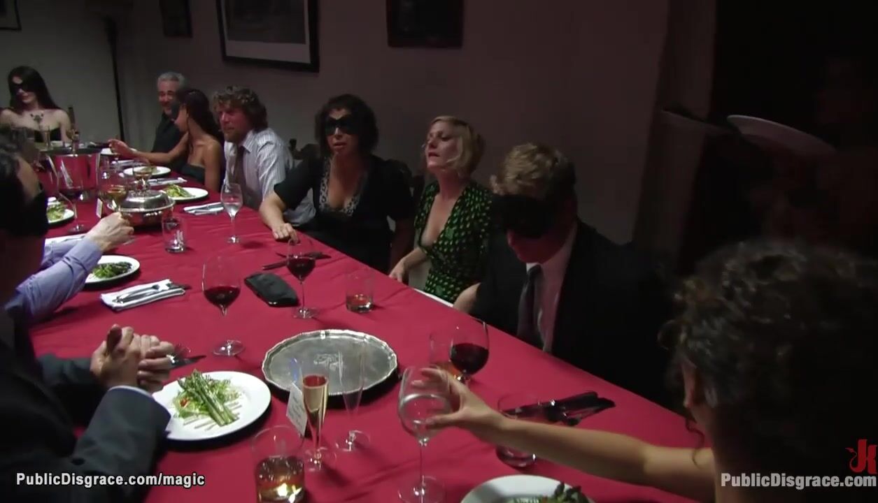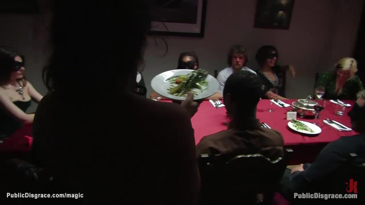 Princess Donna Dolore hosts dinner party and makes hot naked brunette slave with huge tits Charley Chase serve then gang bang fuck big cocks for public